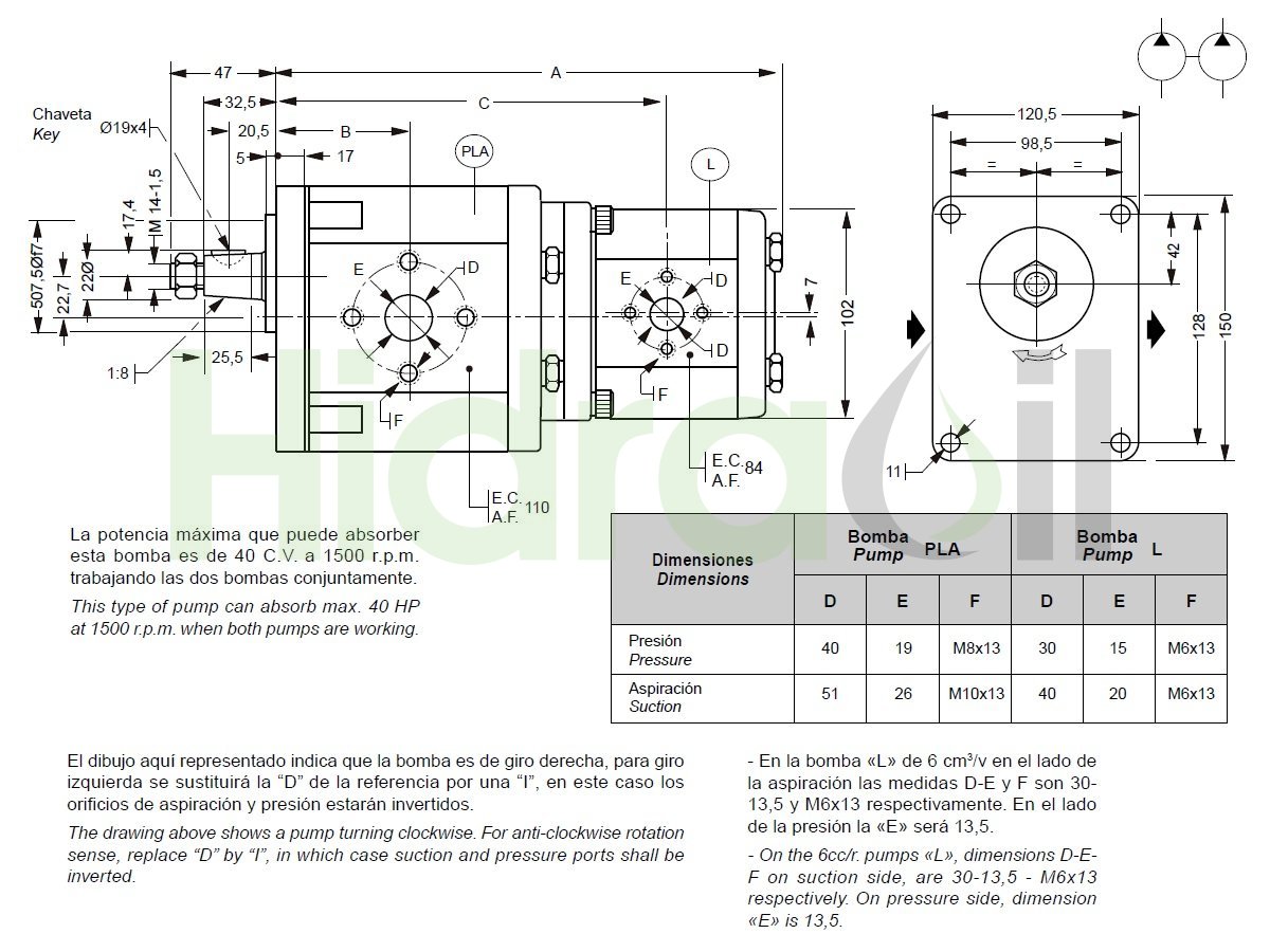 1PLD66-16DE10B Roquet pompe hydraulique double à engrenage 44+10.6 cm3 arbre conique flasque ports rotation droite